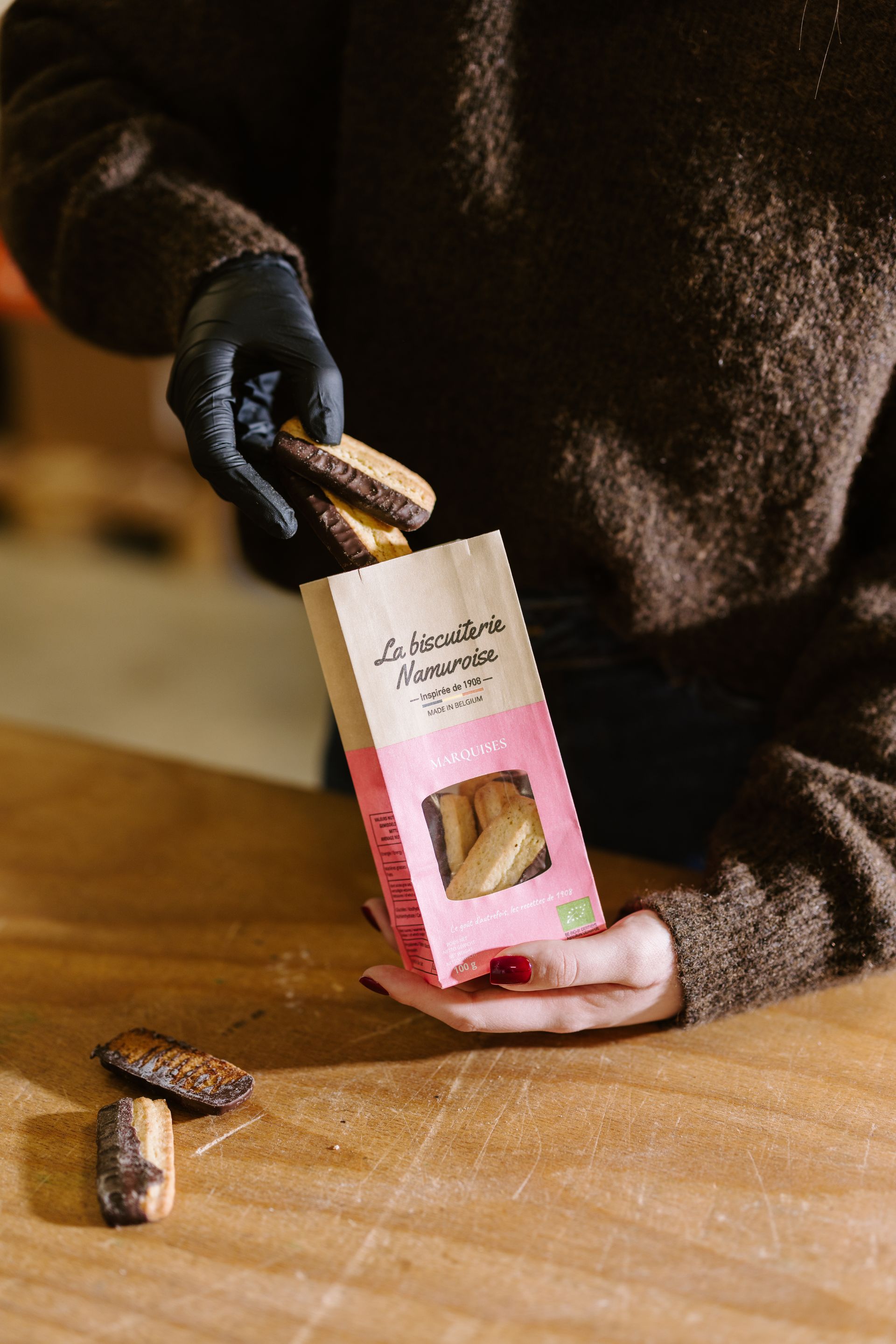 Nous fabriquons des biscuits artisanaux. Tout est confectionné à la main de manière artisanale dans notre atelier Namurois.